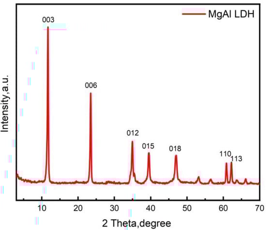 Figure 1 shows the XRD patterns of MgAl LDH synthesized at a crystallization temperature of 150 °C and an aging time of 12 h. All the main diffraction peaks are in good agreement with the features of the hexagonal phase. The (003), (006) and (009) peaks appear at 11.66°, 23.37° and 34.95°, respectively. The (110) peak representing the layered structure appears at 60.47°. The base distance of d(003) is 0.755 nm, and the base distance of d(110) is 0.152 nm. Narrow and sharp diffraction peaks indicate that the samples have good crystallinity and no impurities.