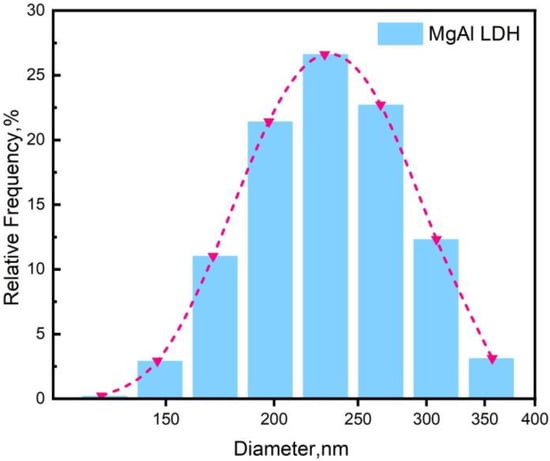 Bar graph for the particle size distribution of MgAl LDH. The red line shows the particle size distribution curve obtained by fitting the bar graph.