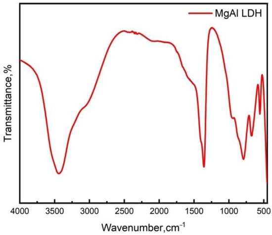 Figure 4 shows the FT-IR spectroscopies of MgAl LDH; the intense band observed at about 3445 cm−1 is assigned to the OH stretching vibration of water molecular and hydroxyl groups of brucite-like layers. The shoulder around 3050 cm−1 is attributed to hydrogen bonds between interlayer water and CO32−. The v3 asymmetric stretching vibration frequency of the CO32− moves to the lower wavenumber of 1369 cm−1, mainly due to interaction of carbonate anions with interlayer water molecules through hydrogen bonds. The v2 and v4 vibrations of CO32− correspond to 943 cm−1 and 677 cm−1, respectively. In addition, the vibrations at about 796 cm−1 and 553 cm−1 can be assigned to the interaction of CO32− with the brucite-like layers.