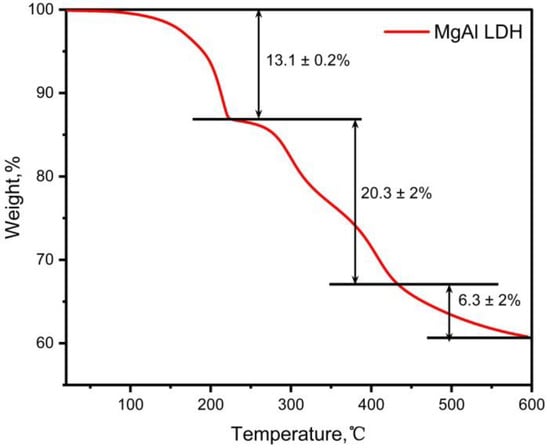 Figure 5 illustrates the TGA curves of MgAl LDH. The thermal decomposition processes of MgAl LDH can be divided into three stages. Stage I occurs from room temperature to 222 °C, owing to evaporation of moisture adsorbed on the outer surface of the nanoplatelets and water molecules existing in the LDH interlayer channels. The weight losses of MgAl LDH in stage I were 13.1 ± 0.2%. ICP results show that the ratio of Mg to Al is around 2:1. In view of the weight loss in stage I, the formula of MgAl LDH can be expressed as Mg2Al(OH)6(CO3)0.5·1.7H2O. The variation from 222 to 430 °C in stage II was attributed to the dehydroxylation of LDH and the release of volatile substances by the interlayer CO32− anions, with weight losses of 20.3 ± 2%. With a further increase in the temperature, CO32− and hydroxyl were eliminated gradually from the interlayer and the layer structure of MgAl LDH collapsed. In this stage, LDH finally transformed into layered double oxides (LDOs), and the residual weights of MgAl LDH were 66.9 ± 2%.