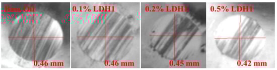 Table 4 shows the lubrication performance of lubricating oil samples with 0.1%, 0.2% and 0.5% LDH1. As shown in the table, the wear scar diameters of lubricating oil samples with 0.1% and 0.2% LDH1 concentration were 0.46 mm and 0.45 mm respectively, basically consistent with the wear scar diameter of base oil, failing to effectively reduce surface wear. When the concentration was increased from 0.2% to 0.5%, the wear scar diameter decreased from 0.45 mm to 0.42 mm in the four-ball test; the wear scar diameter decreases by 0.04 mm compared with the base oil, and the friction performance was significantly improved, indicating that the oil has the best lubrication properties when the concentration of LDH is 0.5%. This can be explained by the fact that at a low concentration, it is difficult to completely cover the metal surface to form an effective protective film. It can also be seen from Figure 6 that the grooves on the wear surface produced by the LDH sample with a concentration of 0.5% are significantly narrower than those of 0.1% and 0.2% and that the wear scars are smaller.