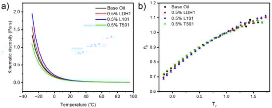 The master curves are shown in Figure 7b and summarized in Table 5. It is clearly seen that the addition of T501 and L101 causes a deviation in the model. Since T501 and L101 reduce the effect of temperature on the viscosity of the lubricant, this deviation of the master curves occurred when the temperature was raised. In the case of LDH, the master curve is in good agreement with the model.