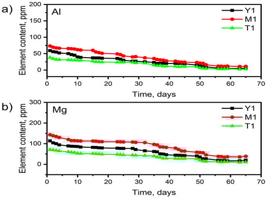 Curve of (a) Al and (b) Mg elemental content over time in samples Y1, M1 and T1.