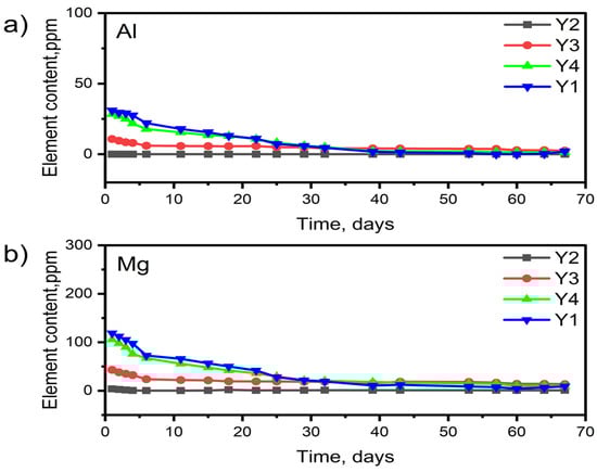 Curve of (a) Al and (b) Mg elemental content over time in samples Y1, Y2, Y3 and Y4.