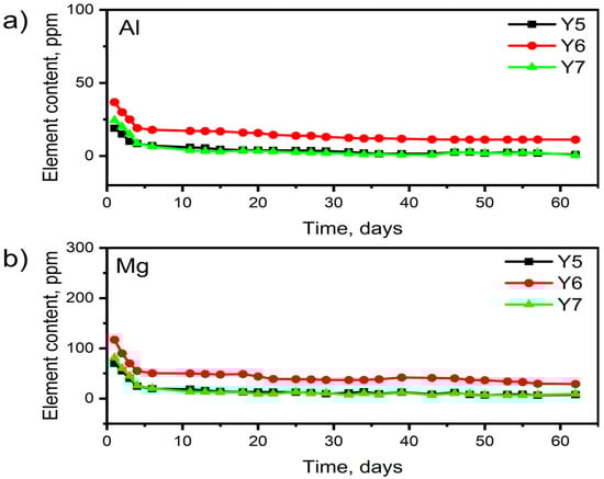 Curve of (a) Al and (b) Mg elemental content over time in samples Y5, Y6 and Y7.