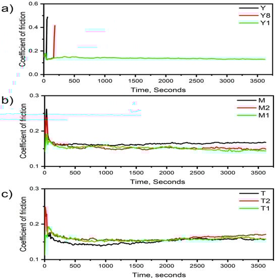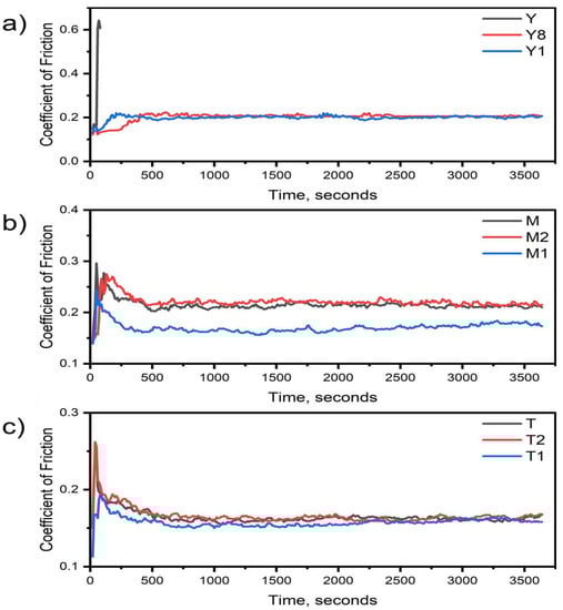 SRV friction coefficient for samples (a) Yubase 6, (b) 500S N and (c) alkyl naphthalene base oils under 100 N.