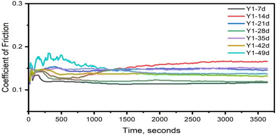 An SRV tester was used to test the antifretting wear performance of the sample under the following conditions: frequency, 40 Hz; amplitude, 1mm; time, 1 h; temperature, 40 °C; load, 100 N. The antiwear properties of different dispersion systems in the same base oil were examined. Figure 13 shows that the coefficient of friction of the sample was significantly reduced after increasing the content of LDH and dispersant in the same base oil. The change in wear resistance over time was investigated. Figure 14 shows that for Y1 samples, the coefficient of friction did not change much within 49 days, and the antiwear performance of LDH in lubricating oil was relatively stable.