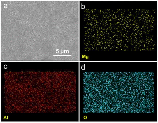 (a) SEM image and EDS results of the SRV platters: (b) Mg, (c) Al and (d) O elements.