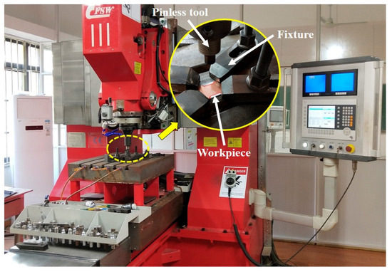 A friction stir processing machine manufactured by Beijing FSW Technology Co., Ltd. (Beijing, China) was used to perform the PFSSW experiments. The experimental platform is shown in Figure 2. A pinless tool with a shoulder diameter of 15 mm and three involute grooves was used to conduct the welding experiments. The depth of involute grooves was 0.5 mm, and the material of the pinless tool was H13 steel.