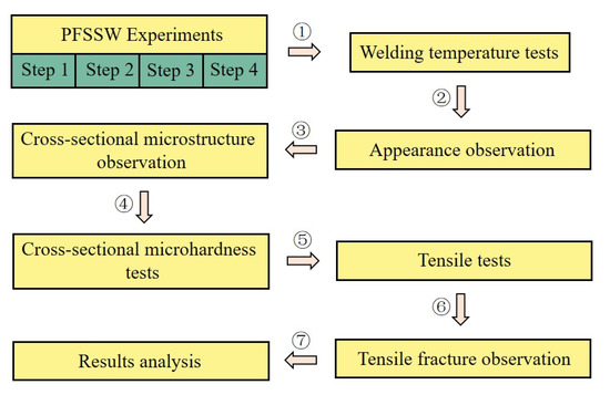 The research process of this work is shown in Figure 4. A K-type thermocouple with a diameter of 1 mm was used to measure the temperature change. The diameter and the depth of temperature measurement hole (P) were 1 mm and 0.6 mm, respectively, as shown in Figure 1. The appearance features of the center and edge of the welded joints were observed with a superdepth digital microscope produced by KEYENCE Co., Ltd. (Osaka, Japan). The welded joints were cut from the center using a wire cutting machine to observe the macroscopic morphology, microstructure, and microhardness of the cross-section. A Vickers hardness tester provided by Laizhou Weiyi Experimental Machine Manufacturing Co., Ltd. (Laizhou, China) was used to test the microhardness of the cross section. The location of the test points for microhardness was set at 0.7 mm below the upper surface of the upper sheet, and the horizontal distance between the test points was 0.3 mm. The microhardness test was performed at a pressure of 0.5 kg and a holding time of 10 s. The tensile tests were adopted to evaluate the strength of the specimens [40,41], and a universal tensile testing machine was used to perform tensile tests with a tensile rate of 1 mm·min−1. Three specimens were tested for each tool plunging path, and the average values were used as the final test results. The fracture morphologies of welded joints were observed by a scanning electron microscope produced by Hitachi Ltd. (Tokyo, Japan).