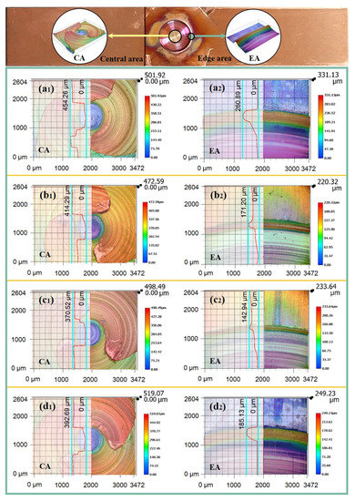 Figure 5 presents the appearance of welded joints under different tool plunging paths. As can be seen from Figure 5, three interlaced convex peaks formed in the center of the welded joints due to the stirring effect of the tool with involute grooves, and there was a circular hole between the three convex peaks, while a circular arc shape feature formed at the edge of the welded joints due to the material flow. The maximum depths of the circular hole at the center of the welded joints under path 1, path 2, path 3, and path 4 were 454.26 μm, 414.29 μm, 370.52 μm, and 392.69 μm, respectively. The maximum heights of the welded joint edges under path 1, path 2, path 3, and path 4 were 260.89 μm, 171.20 μm, 142.94 μm, and 185.13 μm, respectively. It was found that the depth of the circular hole and the height of the welded joint edge generated by path 1 were the largest, followed by path 4 and path 2, and the depth of the circular hole and the height of the welded joint edge of path 3 were the smallest. The depth of the circular hole was closely related to the material flow at the center of the welded joint. The greater the depth of circular hole, the stronger the stirring effect of the tool at the center of welded joint. Figure 5 also indicates that the greater the first plunging depth of the tool, the greater the depth of the circular hole, and the higher the height of the edge of the welded joint.