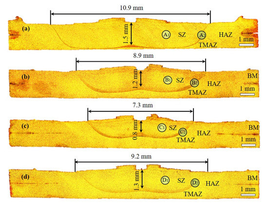 Figure 6 shows the cross-sectional macroscopic morphologies of the welded joints under different tool plunging paths. There were certain differences in the size of the cross-sectional welded joints under different tool plunging paths, but they all presented typical characteristics of the stirring zone (SZ), the thermal-mechanical affected zone (TMAZ), and the heat-affected zone (HAZ). The maximum widths of the stirring zones in path 1, path 2, path 3, and path 4 were 10.9 mm, 8.9 mm, 7.3 mm, and 9.2 mm, respectively, and the heights of the stirring zones at the centers of the welded joints under path 1, path 2, path 3, and path 4 were 1.5 mm, 1.2 mm, 0.8 mm and 1.3 mm, respectively. On the whole, the range of the stirring zone generated by path 1 was the largest, followed by path 4 and path 2, and the range of stirring zone formed by path 3 was the smallest, which indicates that the greater the first plunging depth, the greater the width and depth of the stirring zone.