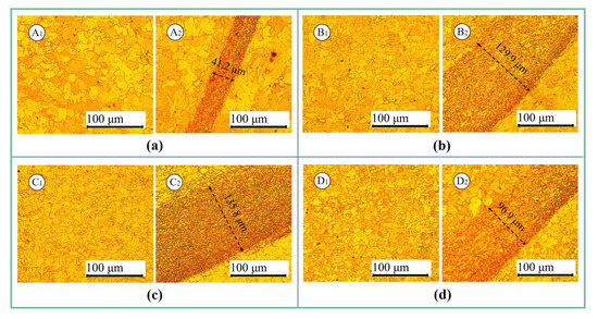 It can be seen from Figure 7 that the grains in the stirring zone under path 1 were significantly larger than those under path 2, path 3, and path 4, which may be due to the higher temperature generated under path 1, causing the grains in the stirring zone to grow under the effect of higher temperature [42,43]. Furthermore, path 1 produced the smallest thermal-mechanical affected zone width of 41.2 μm, followed by path 4, which produced a width of 96.9 μm, while path 2 and path 3 produced a larger thermal-mechanical affected zone width. This suggests that the tool plunging path has a great influence on the width of the thermal-mechanical affected zone. The reason for the larger width of the thermal-mechanical affected zone produced by the step-by-step plunging path may be related to the first dwell after the first plunging stage. The material at the bottom of the tool during the first dwell stage is preheated, and when the tool plunges for the second time, the already softened material is more sensitive to the mechanical stirring effect of the tool, resulting in a larger range of the thermal-mechanical-affected zone. Comparing Figure 6 and Figure 7, it can be found that although the stirring zone range under path 1 was the largest, the grains in the stirring zone were larger and the width of the thermal-mechanical-affected zone was the smallest.