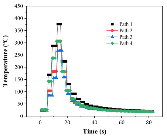 Figure 8 shows the changes in the welding temperature for different tool plunging paths. The overall temperature change during the PFSSW process showed a trend of first increasing, then decreasing, and finally stabilizing. During the plunging and dwell stage of the tool, a large amount of heat is generated in the welding area due to the friction between the tool and the material and the plastic deformation of material, resulting in a continuous increase in the welding temperature. In the stage of tool retraction, since the tool is separated from the material, no frictional heat is generated, and the welded joint dissipates heat naturally at room temperature, so the temperature continues to drop to room temperature. Path 1 obtained the highest peak temperature of 376 °C, and path 3 had the lowest peak temperature of 268 °C. The peak temperatures of path 2 and path 4 were close to each other at 307 °C and 306 °C, respectively. In path 1, due to the continuous plunging of the tool, the plastic flow of the material in the welding zone was greater, and more frictional heat was generated, which is one of the main reasons for the larger grains under this condition. Figure 8 also shows that the greater the initial plunging amount of the tool, the faster the temperature rise rate during the tool plunging and dwell stages.
