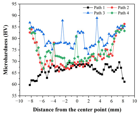 Figure 9 shows the cross-sectional microhardness of the welded joints under different tool plunging paths. In path 1, the microhardness at the edge of the welded joint was lower than that at the center of the stirring zone, and was far from reaching the microhardness of the base metal (89 HV). This was mainly due to the range of the stirring zone of path 1 being larger, and the range of the heat-affected zone formed under the influence of higher temperature was also larger, and the limited test points did not reach the base metal area. The microhardness of path 2, path 3, and path 4 gradually decreased when moving from the edge of the welded joint to the stirring zone, and rose when it reached the vicinity of the stirring zone, which is consistent with the findings of [44]. The gradual decrease in microhardness when moving from the edge of the welded joint to the stirring zone may be related to the decrease in dislocation density [45]. In addition, excessive aging can also reduce the microhardness of the heat-affected zone [46]. Two hard spots appeared around −2 mm and +4 mm of path 3, which were located near the stirring zone and the thermal-mechanical affected zone. The reason for this may be attributed to the effects of strain hardening [27]. In general, the microhardness of path 3 in the stirring zone was higher, followed by path 4 and path 2, and the microhardness of path 1 in the stirring zone was lower, which indicates that the step-by-step plunging path is favorable for increasing the microhardness in the stirring zone.