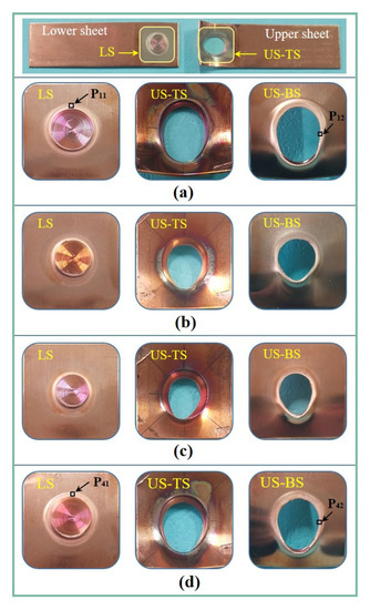 Figure 11 shows the fracture pictures of the welded joints under different tool plunging paths (LS means the lower sheet, US-TS means the top surface of upper sheet, and US-BS means the bottom surface of the upper sheet). It is clear that the welded joints were completely pulled out from the upper sheet and were tightly bonded to the lower sheet, which is a typical nugget pullout fracture mode of friction stir spot welding. This fracture mode was also observed in [47]. The size order of the tightly bonded welded joint on the lower sheet was path 1, path 4, path 2, and path 3, which is consistent with the variation law of the maximum width of the stirring zone. It can be concluded from the fracture mode that good metallurgical bonding formed in the welded joints under different tool plunging paths.