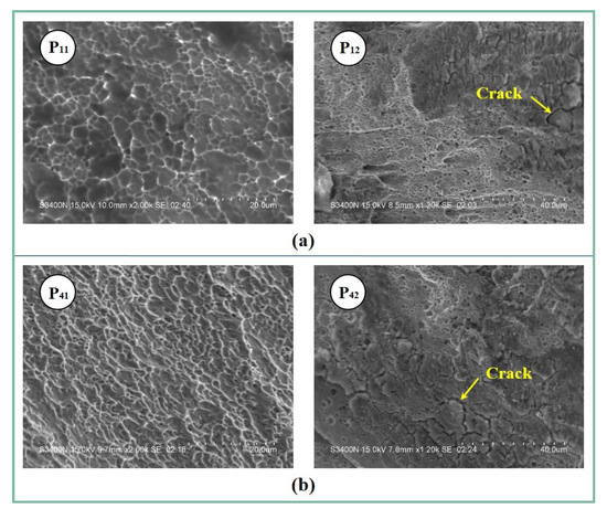 It can be observed from Figure 12 that the fracture morphologies of path 1 and path 4 were composed of dimples of different sizes, which indicates that the fracture types of the welded joints in path 1 and path 4 were both ductile fracture [48]. Furthermore, the dimple size of path 4 was smaller than that of path 1, and the distribution was denser, which indicates that the joint surface of the welded joint of path 4 produced a better bonding quality. This may be attributed to the finer grain structure and wider thermal-mechanical affected zone of path 4 [49]. Cracks could be observed in the P12 and P42 areas of the upper sheet, which were caused by the continuous elongation of the material in this area during the stretching process. The cracks in path 4 were larger than that in path 1, which indicates that the welded joint of path 4 was subjected to greater tensile force during the tensile process. This is consistent with the changes in the tensile shear failure load of path 1 and path 4.