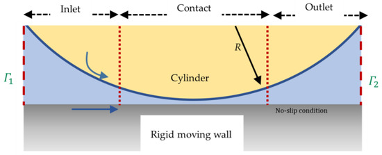 26], in their pioneering work, opted to solve the Navier–Stokes equations instead of the Reynolds equation to simulate TEHL contacts. They used a single-phase CFD model, which involved solving equations for mass and momentum conservation, as well as an energy equation. They successfully simulated TEHL contact with a maximum contact pressure of