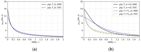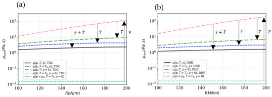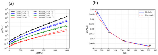 43] for Squalane. A deviation between the predicted Newtonian viscosity by the Roelands–Houpert and Doolittle models can be identified as the pressure and temperature increase. This deviation can be related to the pressure and temperature dependencies of viscosity,