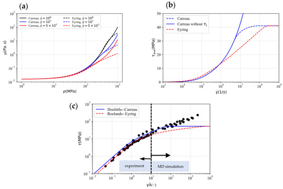 45]. The MD results at high shear stress cannot be perfectly fitted by any of these models. Furthermore, MD simulation cannot describe the limiting shear stress. Even so, Carreau and Eyring can be compared with the master curve.