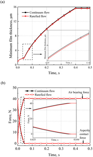 - Compared to the continuum flow, the minimum air film thickness and air bearing force of the AFTB, considering the rarefied flow effect, are lower. However, the lift-off speed and the asperity contact pressure of the AFTB are higher during the start-up process.