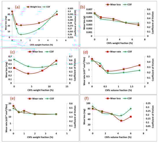 ![]() | At a very low concentration of CNTs, the composite had low COF improvement; at too excessive a volume fraction, the improvement was still low. It was an optimal concentration (4 vol.%) that gave the highest improvement in Al alloys. | [28,29,30,31,32] |