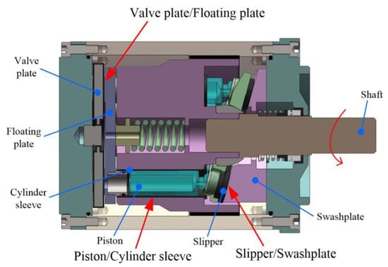 Figure 1 shows the structure of a WLPP. Its working principle is as follows. The rotating shaft drives the slipper to slide on the surface of the swashplate. The piston also rotates with the shaft and reciprocates in the cylinder sleeve. At the same time, the rotating shaft drives the floating plate to slide on the surface of the valve plate. Under the action of this motion and the hydraulic pressure, it forms three major friction pairs of the water pump, namely, the slipper/swashplate pair, the piston/cylinder sleeve pair and the valve plate/floating plate pair. These three friction pairs perform bearing and sealing functions [6]. However, compared with mineral oil, water has low viscosity, strong corrosion, high vaporization pressure and other physical and chemical properties [7], which make the friction pairs of a WLPP face serious friction and lubrication problems.