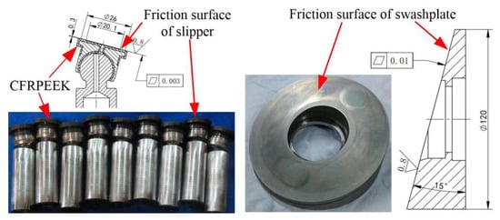 As shown in Figure 2, the friction surface of slippers is coated with CFRPEEK by injection molding process, and its roughness and flatness are not greater than 0.8 μm and 0.003 mm, respectively. The swashplate parts are made of 316L and 1Cr17Ni2, and the heat treatment process is the same as that of the upper samples. The roughness and flatness of swashplate parts are less than 0.8 μm and 0.01 mm, respectively.