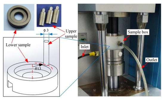 A pin-on-disc friction testing machine (MMU–10, SHIJIN, Jinan, China) was utilized for tribological tests. As shown in Figure 3, the upper sample (stainless steel pin) and the lower sample (CFRPEEK disc) were installed in the sample box. Circulating water flowed into the sample box from the inlet and flowed out from the outlet for lubrication. The temperature of water was kept between 22–25 °C.