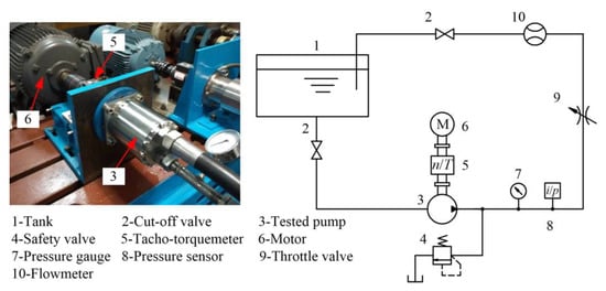 Figure 4 shows the principle of the experimental system for testing the slipper/swashplate pairs of the WLPP. Slipper/swashplate pairs of different materials were installed in the tested pump to evaluate their tribological performance under real working conditions. A safety valve (4) was used to prevent system overpressure. The outlet pressure of the tested pump was regulated by the throttle valve (9), and measured by the pressure sensor (8, range: 0–25 MPa, accuracy: ±0.25% FS). The outlet flow was measured by flowmeter (10, range: 1–10 m3/h, accuracy: ±1% FS). The input speed and torque of the tested pump were measured by the tacho-torquemeter (5, range: 0–200 Nm, 0–5000 rpm, accuracy: ±0.1% FS). The change in pump volumetric efficiency could indirectly represent the wear of internal parts [31,32]. Its volumetric efficiency (ηv) could be expressed as follows: