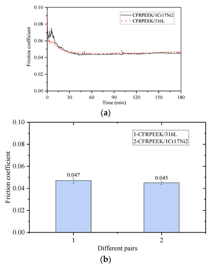 In order to observe the friction and wear of materials in a short timeframe, the testing conditions in the friction testing machine were set to a contact pressure of 10 MPa and a sliding speed of 2 m/s. Each group of tests was carried out continuously for 180 min. The change in friction coefficients of the 316L/CFRPEEK and 1Cr17Ni2/CFRPEEK pairs, with time elapsed, is shown in Figure 5a. Both pairs have a running-in stage, after which the friction coefficient is stable. In order to compare the friction coefficient difference between the two materials, the average value of multiple sets of data is calculated, as shown in Figure 5b. Although the materials matched with CFRPEEK are different, the friction coefficients of the two pairs are slightly different. This means that different metal materials have little influence on the friction coefficient within the friction testing machine.