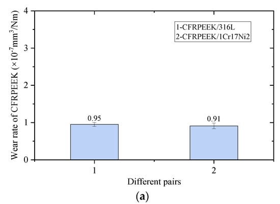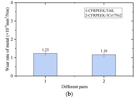 Furthermore, the wear rates of CFRPEEK and the two metals are also tested, as shown in Figure 6. In these two pairs, the wear rates of CFRPEEK have little difference, with the order of 10−7, which is similar to the results from previous studies [20,33]. Similarly, the wear rates of the two metals are similar, but are far less than the difference in CFRPEEK, with the order of 10−9. This means that the two metals are more wear-resistant than CFRPEEK.