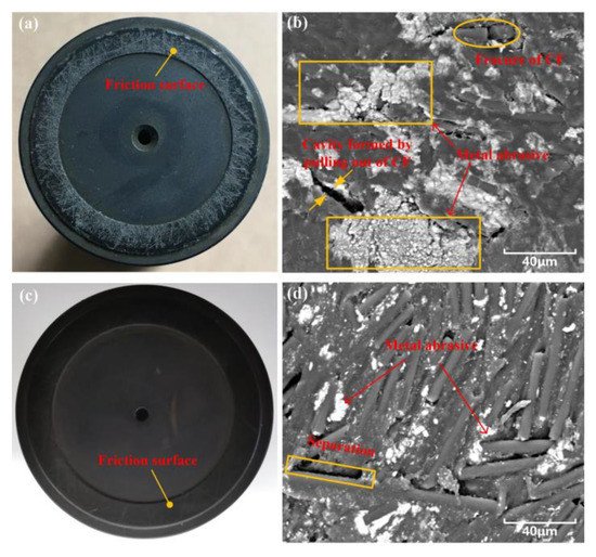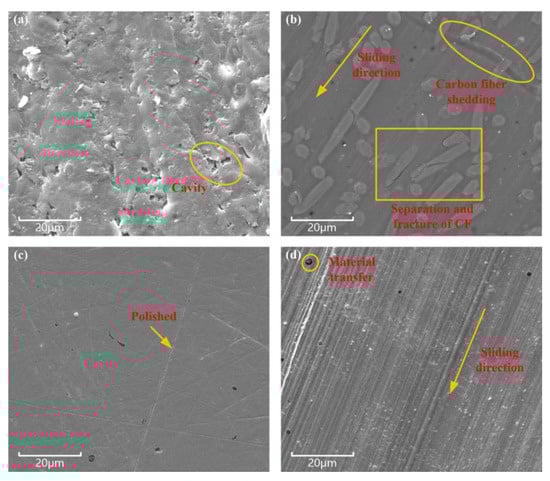 The surface morphology of the 316L/CFRPEEK pair is similar to that of the 1Cr17Ni2/CFRPEEK pair after testing. An environmental scanning electron microscope (ESEM, FEI Quanta 200) was used to analyze the morphology of the samples. Due to the non-conductivity of CFRPEEK, the CFRPEEK samples were subjected to a gold-plating treatment before the morphology was calculated. Only the ESEM image of the 1Cr17Ni2/CFRPEEK pair is analyzed below. As shown in Figure 7a, there are some cavities on the surface of the unused CFRPEEK, which may be formed by the fracture and extraction of carbon fibers caused by mechanical cutting and the sanding with the abrasive paper. Compared with the worn CFRPEEK surface (see Figure 7b), the cavities on unused CFRPEEK surface disappear due to wear. Furthermore, the carbon fibers thin and break due to wear. More significantly, the carbon fibers are separated and pulled out from the PEEK matrix [20]. The wear mechanisms of CFRPEEK are mainly surface fatigue wear and adhesive wear [34].
