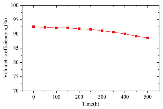For the tested pump with the 1Cr17Ni2 swashplate, the vibration, noise and shell temperature were normal during the test. Under the working conditions of 14 MPa and 1500 rpm, the tested pump was worked for 6–8 h every day, with a total final testing time of 500 h. Its volumetric efficiency was tested. The volumetric efficiency of the pump changed with time elapsed, as shown in Figure 8. The volumetric efficiency of the pump decreased gradually with the increase in operation time, from 92.5% at the beginning to 88.6% at 500 h. This indirectly reflected the wear of the moving parts, which increased the fit or seal clearance, resulting in increased leakage and reduced volumetric efficiency [37].