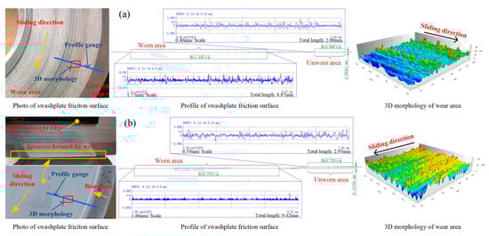 By comparison, the friction surface of the 1Cr17Ni2 swashplate is much smoother, as shown in Figure 9b; however, due to the wear caused by long-time operation under high pressure, there are an grooves on the swashplate surface. Similarly, a clear boundary (step) is formed between the worn area and the non-worn area. The profile of the 1Cr17Ni2 swashplate was tested with the same method and position. The wear area is smoother than the non-wear area, and the roughness is reduced from Ra0.729 μm to Ra0.238 μm. This means that the 1Cr17Ni2 swashplate is polished by CFRPEEK. The 3D morphology observation results also show that the maximum contour height difference is less than 20 μm, and the surface roughness is Sa2.35 μm. Nevertheless, the depth of the wear marks on the swashplate surface reaches 0.128 mm, and the metal is considerably worn away, which is obviously different from the wear rate results obtained using the friction testing machine.