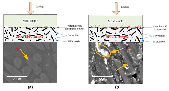Figure 11a shows the wear mechanism of CFRPEEK against two stainless steels under atmospheric pressure water lubrication, which is used to analyze the wear condition in the friction testing machine. Under the action of the test load, contact stress is generated between the metal sample and the CFRPEEK sample. The carbon fibers and the PEEK matrix in the contact area jointly bear the contact stress. Because the lubricating water is at atmospheric pressure, it cannot cause microdeformation on the surface of the carbon fibers or the PEEK matrix, but it still plays the role of lubrication and cooling. With the low hardness and strength of CFRPEEK, its wear rate is larger than that of metal. The worn surface of CFRPEEK is also relatively flat.