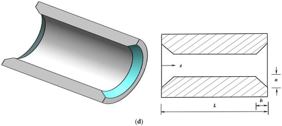 The bearing with a variable profile was illustrated previously in Figure 1c. More detail about this profile variation can be found in [19]. The resulting gap in the circumferential direction related to this variation as a function of the z position along the bearing length is given by [19]: