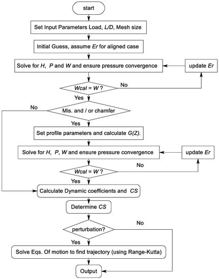 The convergence condition of the pressure values is given by . Furthermore, after obtaining the pressure convergence, the resultant hydrodynamic load is calculated. This load is then compared with the actual supported load to achieve an accurate load condition of . If this condition is not satisfied, the eccentricity ratio changes, and the pressure field is again determined based on the newly updated eccentricity ratio. This process is repeated until the load (as well as the pressure) convergence is achieved. This load corresponds to in the aligned case. A flow chart for the general solution procedure is shown in Figure 3. After obtaining the solution convergences, the stuffiness and damping coefficients are calculated, and then the time responses to the position perturbation are determined by solving the equations of motion based on the Runge–Kutta method.