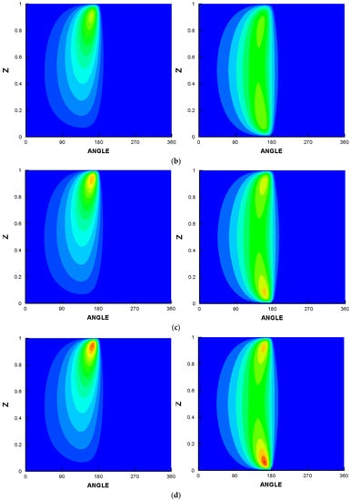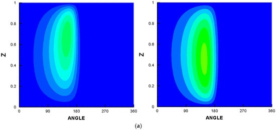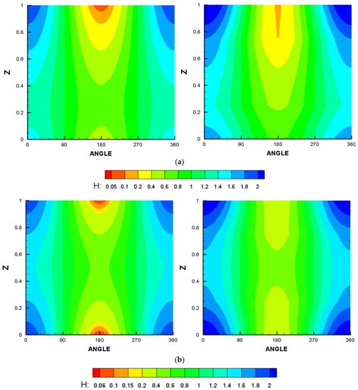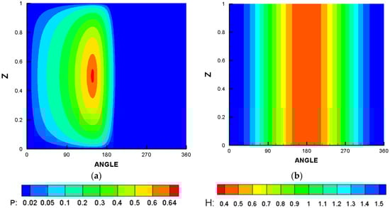 The results of the solution for the case of the perfectly aligned bearing are shown in Figure 4 for a finite length bearing where and the eccentricity ratio () is 0.6. Figure 4a shows the dimensionless pressure distribution, and Figure 4b illustrates the dimensionless film thickness levels. The determination of the cavitation zone is important for the purpose of obtaining the correct solution for the hydrodynamic problem of the journal bearing as the pressure generation extends beyond the position of 180°, as shown in Figure 4a. It can be seen that the pressure distribution is symmetrical with the center of the bearing width (), where its maximum value is at this position. In addition, the film thickness levels are also symmetrical with the position of minimum film thickness where the angle in the circumferential direction is 180°. Furthermore, the film thickness value at any position in the circumferential direction is constant (extruded shape) along the bearing width. However, this ideal situation rarely exists in the typical usages of this type of bearing as the bearing system is usually subjected to some degree of misalignment, which affects the shape and the values of the film and pressure distributions.