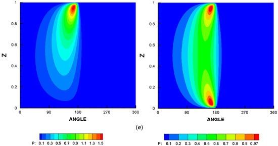 Figure 5 illustrates this concept, where two cases of misalignment are considered. The dimensionless pressure distributions on the left side correspond to the misalignment case in the vertical direction only, while the right side shows the pressure distributions for the general case of 3D misalignment where the shaft deviation takes place in the vertical and horizontal directions. The misalignment due to only horizontal deviation is not considered, as the vertical misalignment usually accompanies the journal bearing system as a result of shaft deformation under the supported load. It is worth mentioning that each side has a different legend, as using a single unified legend does not give a clear picture of the differences between the two cases. Five values for the misalignment parameters are examined in this figure for each case, which are for the first case and for the second 3D case. These values range from light to extreme levels of misalignment. In comparison with the pressure distribution of the perfectly aligned bearing shown previously in Figure 4, two distinguished features can be observed from the results shown in Figure 5. The first thing is that the maximum pressure increased significantly as the misalignment parameters increased and concentrated close to the bearing edge, where the misalignment effect is the maximum in reducing the gap between the shaft and the bearing wall. The second issue is that the pressure distribution is no longer symmetrical due to the misalignment. These two features are more clear at the extreme levels of misalignment, particularly in the last case, Figure 5e, where the misalignment parameter is 0.59. Furthermore, the vertical misalignment negatively affects the pressure distribution in terms of the maximum pressure values and the asymmetricity in the distribution of the pressure levels. However, the 3D misalignment, as will be shown later, has a larger drawback regarding the friction coefficient.