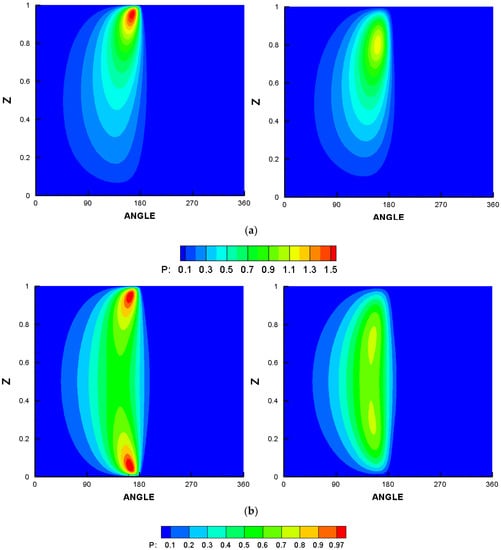 As explained previously, the perfect alignment of the bearing system is hard to achieve in industrial applications, where the presence of misalignment is actually unavoidable. Using a variable profile in the longitudinal bearing direction can be used to reduce the misalignment effect by reducing the pressure levels and increasing the minimum film thickness, which means, in other words, extending the life of the bearing. Figure 6 illustrates this effect where the bearings in the last extreme cases shown in the previous figure (Figure 5e) are modified. The pressure distributions of Figure 5e are repeated here for the purpose of comparison with the modified bearings. The modification parameters used in this figure are (more details about the effect of the modification parameters will be explained later in the following figures). Figure 6a shows the modification effect on the pressure distribution of the bearing system when the misalignment presents in the vertical direction. The maximum pressure value was reduced by 26.6% (from 1.58 to 1.16) due to this modification. The pressure spike is relatively shifted away from the bearing edge, which may help prevent the bearing wear at the bearing edge. Similar behavior can be seen in the case of 3D misalignment, as shown in Figure 6b, where is reduced by 29.2% (from 1.06 to 0.75) in addition to shifting the pressure spikes from the bearing edges.
