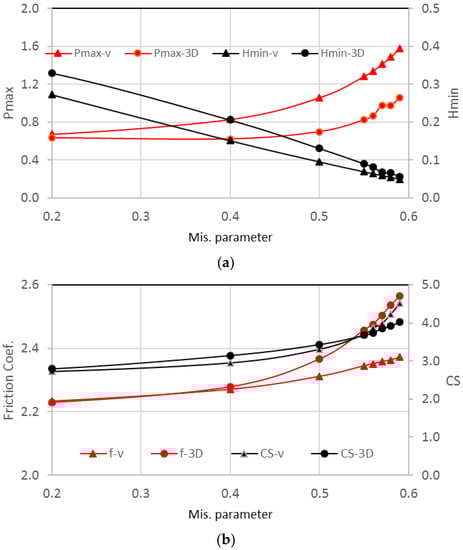 Effect of the dimensionless misalignment parameters for the two cases of misalignment (vertical and 3D) on the dimensionless: (a) Pmax and Hmin and (b) friction coefficient and critical speed.