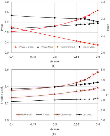 Effect of profile modification (3D misalignment) on the dimensionless: (a) Pmax and Hmin and (b) friction coefficient and critical speed. .