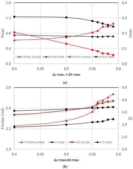 Figure 9 shows the effect of bearing profile modification on the bearing characteristics for the first case of vertical misalignment when the modification parameters are . Figure 9a illustrates this effect on and where the modification reduces the maximum pressure and increases the minimum film thickness. The reduction in is 26.6% and the increase in is about three times the corresponding unmodified misaligned bearing when as explained previously. The corresponding effects of profile modification on the friction coefficient and the critical speed for the first case of vertical misalignment are shown in Figure 9b. It can be seen that the friction coefficient is reduced by 4.97% (from 2.3718 to 2.2539). The critical speed of the misaligned bearing, on the other hand, is also reduced as a result of the modification, but the positive thing is that the critical speed for the modified bearing (3.6906) is greater than that of the perfectly aligned bearing (2.6789).