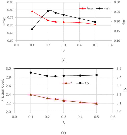 The effect of the chamfer parameter, , which represents the amount of material removal from the bearing’s inner surface in the longitudinal direction of the bearing, is illustrated in Figure 11. Figure 11a represents the variation of and with and Figure 11b illustrates the corresponding variations in the friction coefficient and the critical speed. It can be seen that the optimum range of is where the four examined characteristics responded more efficiently over this range. The other modification parameter, , which represents the amount of material removal in the radial direction from the bearing inner surface, has also been examined in detail, where the optimum value is found to be 0.25.