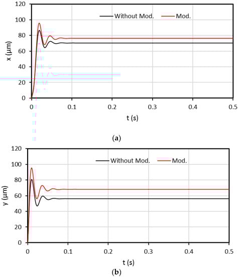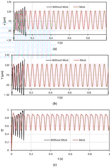 The investigation of the bearing modification is further extended to include the time response of the journal to the position perturbation. If the journal shifts to the bearing center and is released, the resulting movement of its center reflects its stability characteristics. If the journal returns to its equilibrium position, this means that the rotor-bearing system is stable. On the other hand, for the critical case, the shaft is whirling around the equilibrium position. If the shaft rotates at a speed greater than its critical speed, the vibration amplitude will increase with time until it reaches the bearing wall. Therefore, the stability of the modified and unmodified bearings is examined in terms of the time response of the position coordinates and and the eccentricity ratio, under four operation speeds. The first speed is less than the critical speed of both modified and unmodified bearings, with the responses shown in Figure 12. It can be seen that the shaft center returns to its equilibrium position after a relatively short period of time which means, in other words, that the system for both bearings is stable. Figure 13 illustrates the time responses when the journal rotates at a speed equal to the critical speed of the unmodified bearing. It can be seen that the modified bearing is stable as it returns to its equilibrium position after about 3 s while all the responses of the unmodified bearing repeated with time, which means that the bearing system is under a critical situation. The third chosen speed is the critical speed of the modified bearing, where the time responses under this operating speed are illustrated in Figure 14. It can be seen that when the and response of the unmodified bearing increased with time and exceeded 140 when (see Figure 14a,b) where the radial clearance used in this bearing is 150 . The combination of the and response gives the eccentricity ratio shown in Figure 14c, which is equal to 1 at t = 0.13 s, and which means that the journal surface touches the bearing wall. On the other hand, the , and responses of the modified bearing repeated with time as the bearing rotates at its critical speed. The last case shown in Figure 15 illustrates the responses when the operating speed is less than the critical speed of the modified bearing and greater than the critical speed of the unmodified bearing. It can also be seen that the modified bearing is stable, which requires about 5 s to return to its equilibrium position, while the unmodified bearing is unstable where the journal surface reaches the bearing wall after 0.33 s. It is clear that the modified bearing operates safely over a wider range of speeds compared to the unmodified bearing. It is worth mentioning that the time response of the misaligned and modified bearing is an extremely complex problem as it requires a solution for the equations of motion corresponding to geometry in space. However, this important solution will be addressed by the authors in the near future.