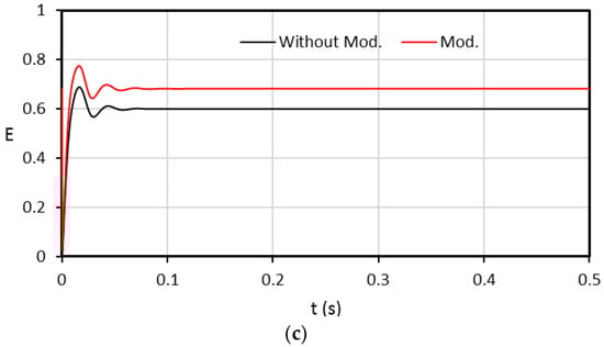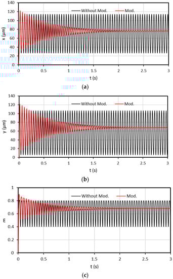 Time response to position perturbation of the rotor bearing system for modified and unmodified profile under a rotational speed less than the critical speed of the unmodified bearing: (a) x(t), (b) y(t), and (c) eccentricity ratio as a function of time.