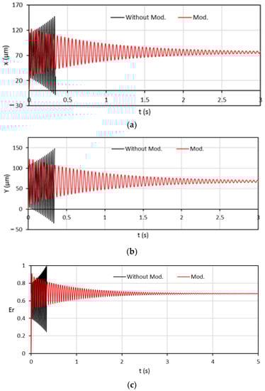 Time response to position perturbation of the rotor bearing system for modified and unmodified profile under a rotational speed greater than the critical speed of the unmodified bearing: (a) x(t), (b) y(t), and (c) eccentricity ratio as a function of time.