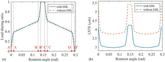 Comparison of load sharing ratio and LSTE with and without considering the effect of EHL by the proposed model for gear pair A ( = 8 mm, = 25 Nm, = 2000 rpm). (a) Load sharing ratio; (b) LSTE.
