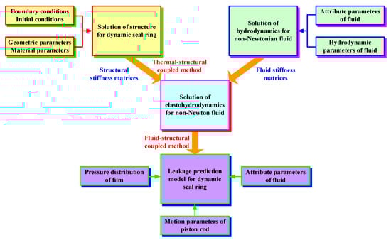 Four modules are contained in the framework: the module of the solution for the structural domain of the dynamic seal ring, the module of the solution for the hydrodynamic domain of non-Newtonian fluid, the module of solution for the elasto-hydrodynamic (EHD) domain and the module of leakage prediction for dynamic seal ring. The final calculation of the leakage prediction is completed by the module of leakage prediction. The output parameter of this module is the leakage amount of the dynamic seal ring, while the input parameters contain parameters of fluid attribute and motion of piston rod as well as pressure distribution of oil film in the sealing clearance.